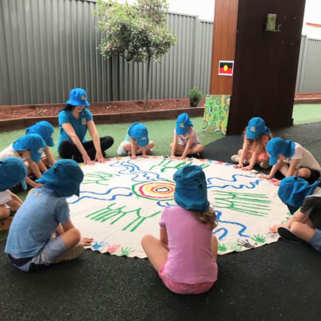As part of our curriculum each day, the Preschool children say an ‘Acknowledgement of Country’ to acknowledge and pay respect to the Traditional Owners and ongoing custodians of this land. The children meet and sit around our Yarning mat, which was made by the children and their educators. The symbols represent, the meeting place, running water and the land.