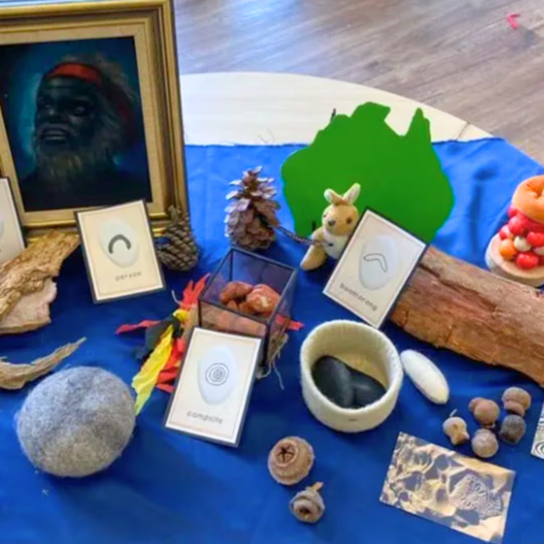 Children in the nursery room at Nido Early School engage with simple provocations involving loose parts and animals to explore Aboriginal symbols and perform Acknowledgements of Country.