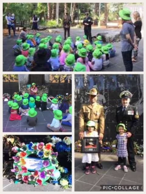 ANZAC Day is a community event that we acknowledge in our Preschool, despite it falling within a holiday period when the preschool is closed. We are situated within Kokoda Park and the children often walk along the information walk way into the memorial area. During this time the children have walked up to the Kokoda Memorial to investigate the wreaths laid down for ANZAC Day Services.
