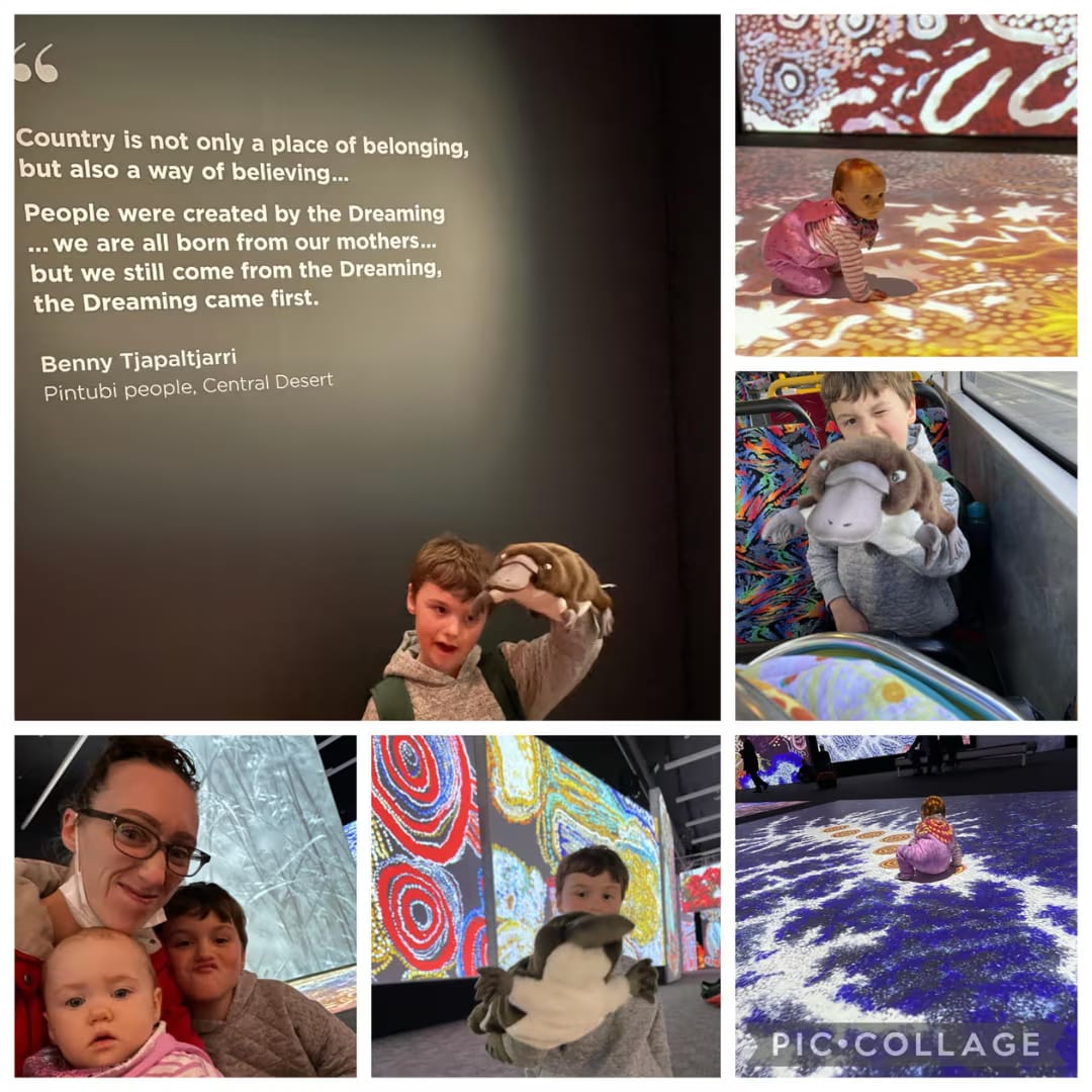 The art, music, photography & dance combination had the kids absolutely enchanted. Evanna was able to crawl around the ground displays & explore the exhibition with another baby, while Dallas & Biladurang chilled out on one of the giant cushions.