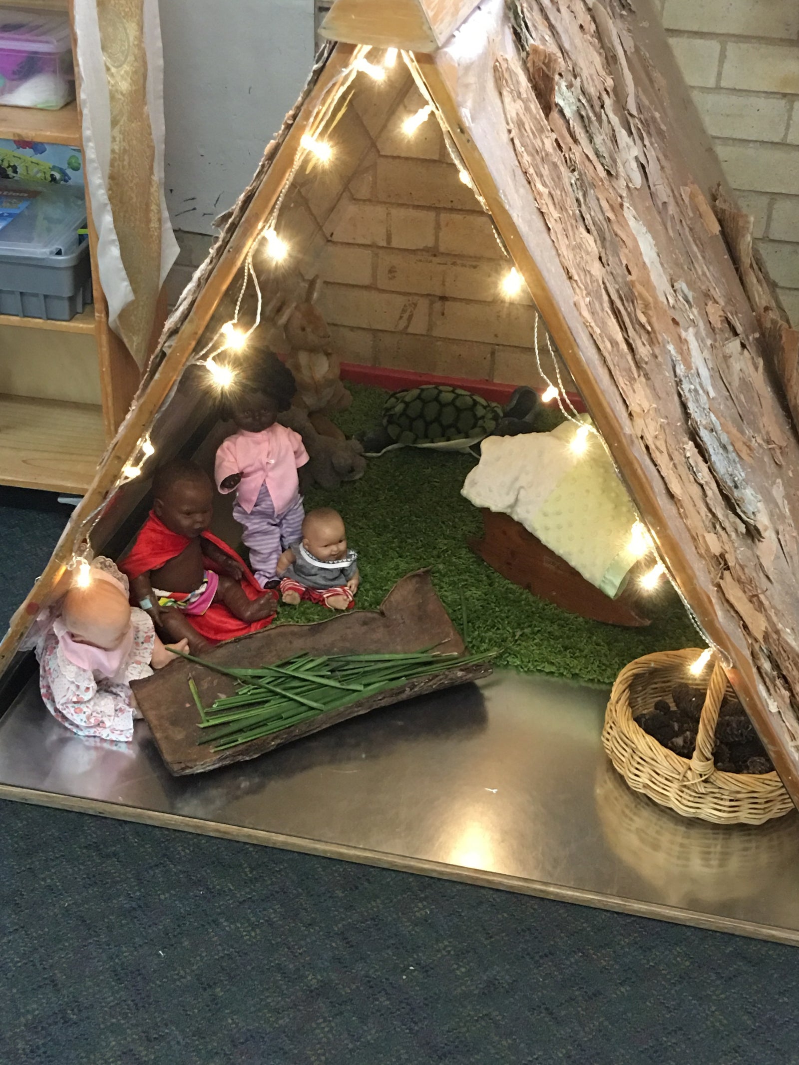 Above: In every play space an Aboriginal perspective is showcased. The paper bark on the outside of this cubby is one of the natural materials that Aboriginal architects used traditionally to construct their homes.