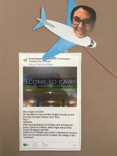 The children created a visual learning map where they tracked Miss Angies travels and learnt vicariously through her holiday experiences.