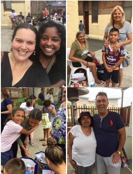 Photo Above: Some of the donations that we received and the wonderful volunteers. Left to Right; Lyn Concord West Rhodes Preschool, Natalie Paddington Children’s Centre, Samantha Paddington Children’s Centre, Kiri Paddington Children’s Centre, Jessica Director of Koori Curriculum, Tacey Duroux Aboriginal Medical Service and Faymarie Leichhardt Council.