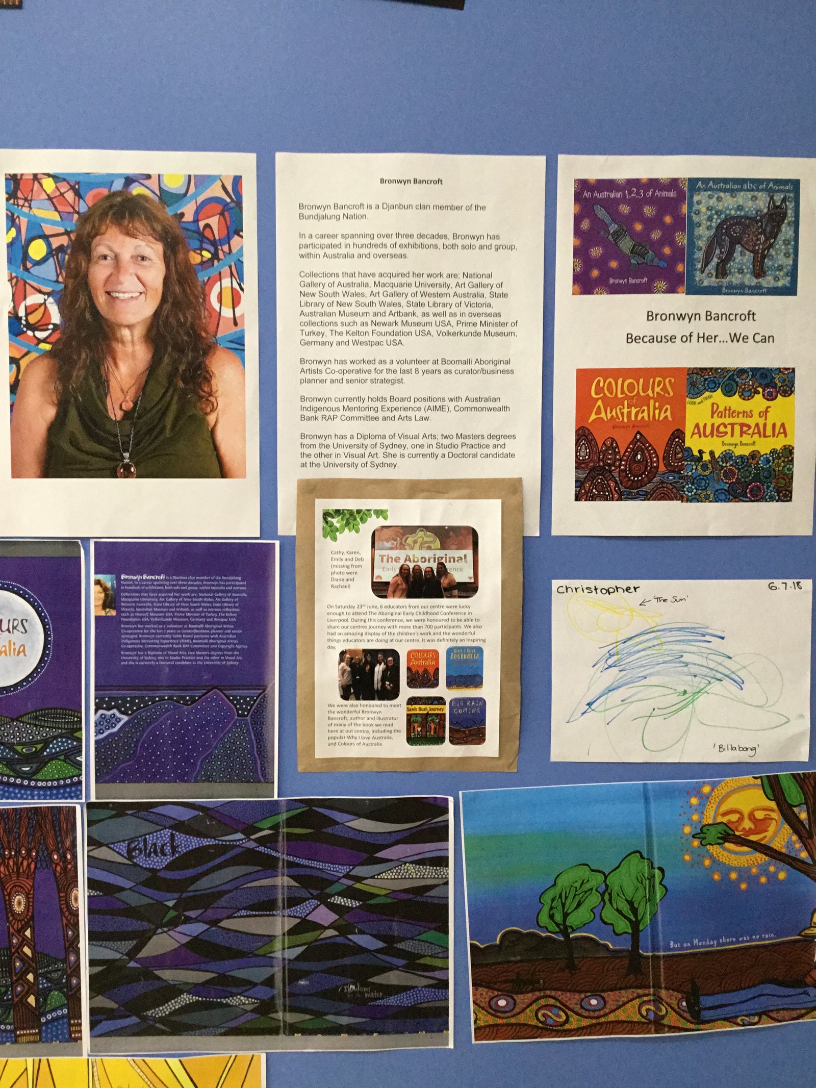 Leading up to NAIDOC Week, I had the exciting opportunity to meet one of my favourite children’s authors and illustrators, Bronwyn Bancroft at the Aboriginal Early Childhood Conference. This was a perfect opportunity to show off the photo of our team with Bronwyn, and inform the Bumblebee’s that we would be looking at some of Bronwyn’s stories as well as her art during NAIDOC Week. Even though we have read many of Bronwyn’s books, we have never really delved in to the artwork that jumps out at you on every page.