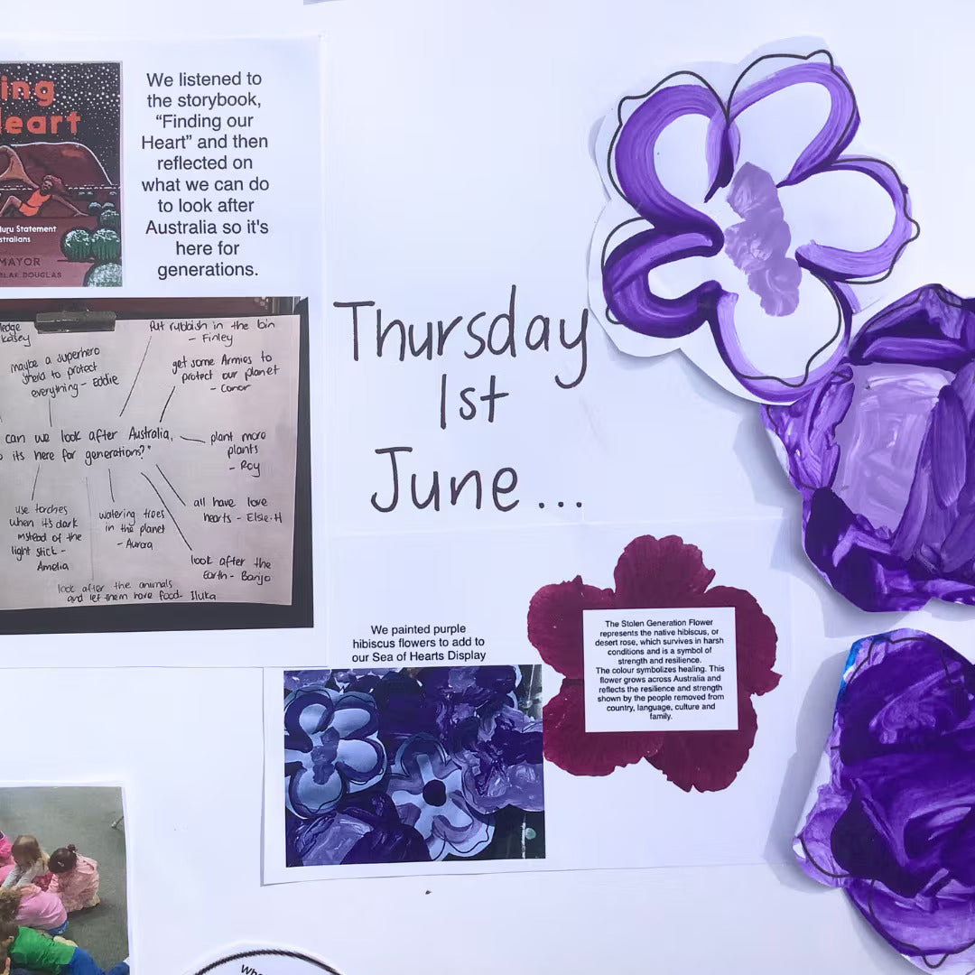 We began reading the children a different book each day and using these amazing stories to guide our conversations and utilise them as reflective pieces and foster further activities; such as, a play space with Indigenous resources, creating purple hibiscus to accompany our reconciliation week display and singing along with tapping sticks to Aunty Wendy’s Mob.