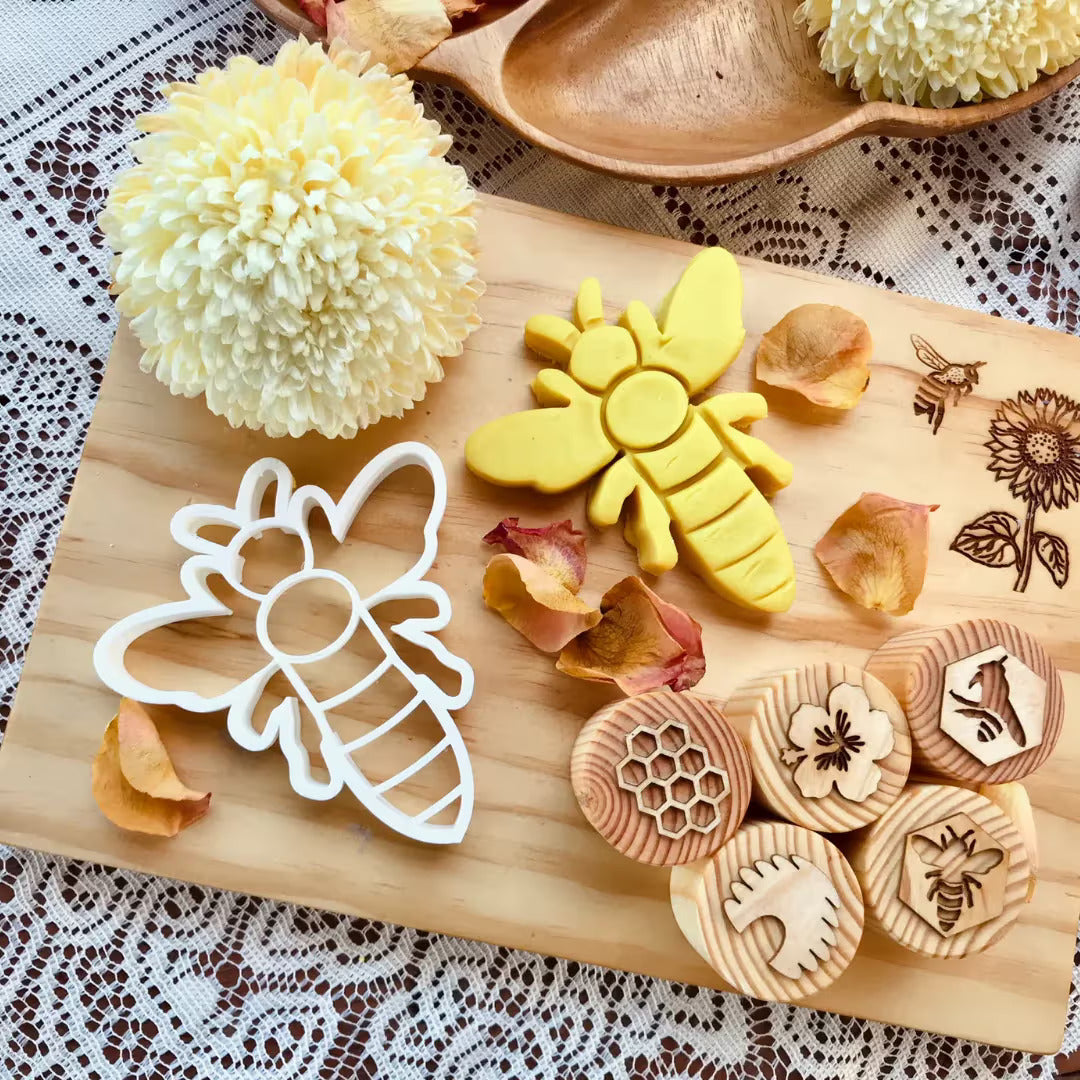 What's not to love about bees?! Here, we've put together some educational resources to support your little pollinator enthusiast to learn through play. This set includes 5 handmade, wooden bee-themed playdough stamps (queen bee, worker bee, hive, honeycomb and a flower)