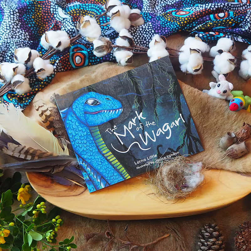 Maadjit Walken is the Sacred Rainbow Serpent. She is the mother spirit and creator of Nyoongar Country in the south-west of Western Australia. She formed the landscape and the waterways and made her first child Maadjit Wagarl, the Sacred Water Snake, the guardian spirit of all the rivers and freshwaters. The Mark of the Wagarl is the story of how a little boy dared to question the wisdom of his elders and why he received the Sacred Water Snake for his totem. Janice Lyndon’s pastel illustrations resonate with the cultural power of the Maadjit Wagarl and the landscape of the south-west.
