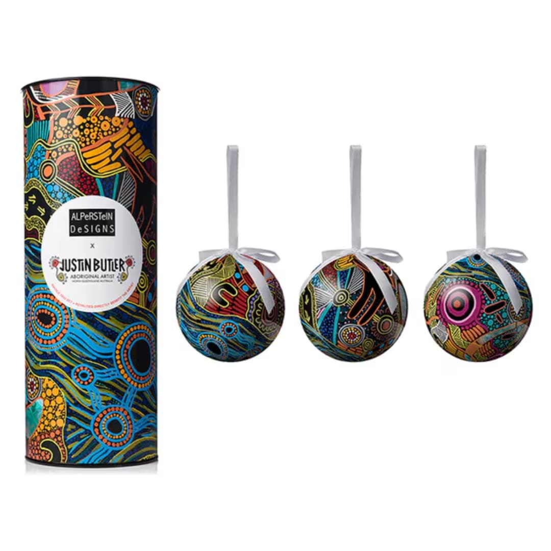 3 Pack Christmas Baubles featuring artwork reproduced under license by Aboriginal artist, Justin Butler from North Queensland, Australia.