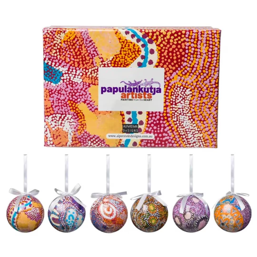 6 Pack Christmas Baubles featuring artwork reproduced under license from Papulankutja Artists. Papulankutja (Blackstone) is a remote Aboriginal Community, located at the foothills of the Blackstone Ranges in the Ngaanyatjarra Lands, Western Australia. As well as their paintings Papulankutja Artists are known for their innovative fibre work and carvings from local wood.