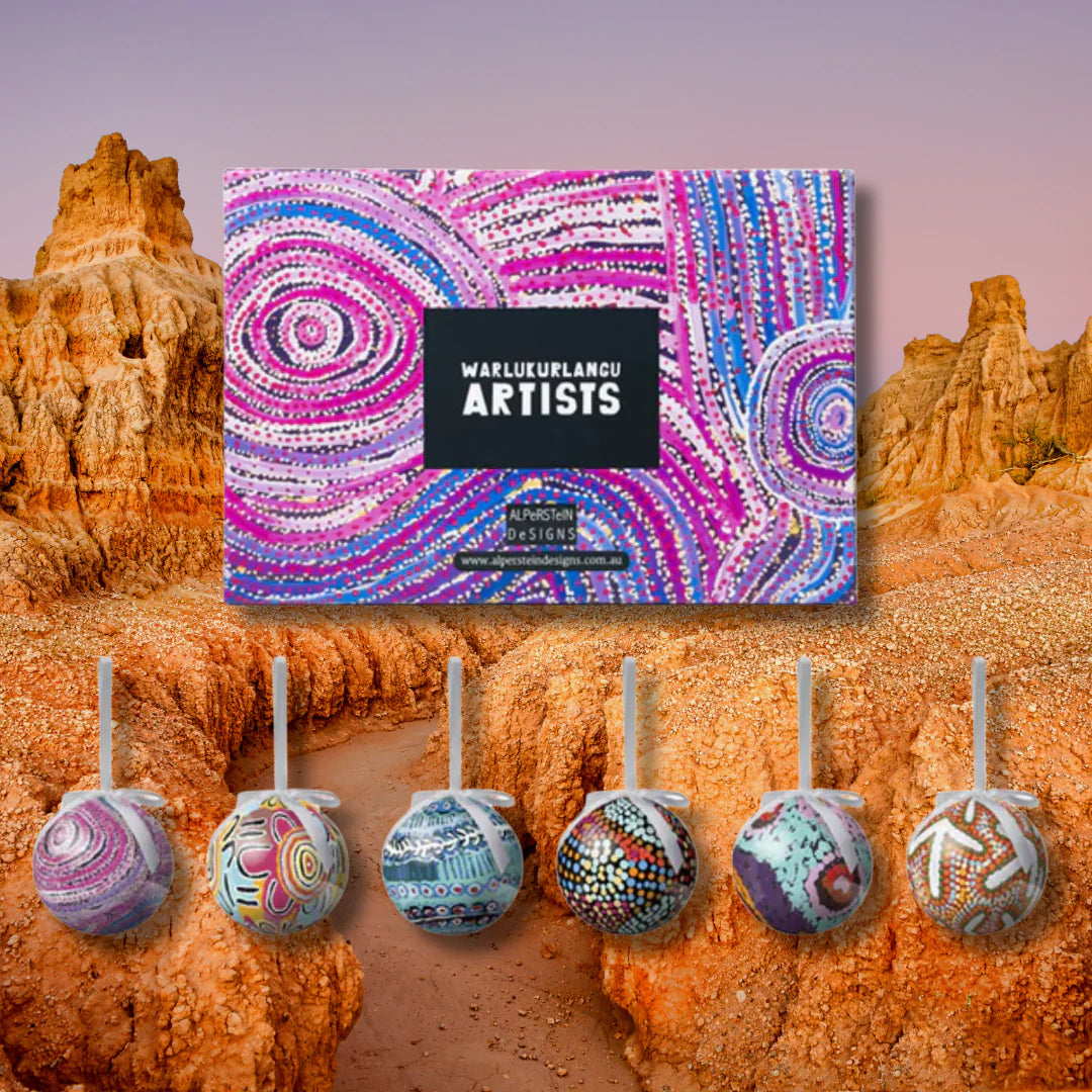6 Pack Christmas Baubles featuring artwork reproduced under license from Warlukurlangu Artists. Established in 1985 Warlukurlangu Artists Aboriginal Corporation is a not-for-profit organisation that is 100% Aboriginal-owned by its artists from the remote desert communities of Yuendumu and Nyirripi in Central Australia.