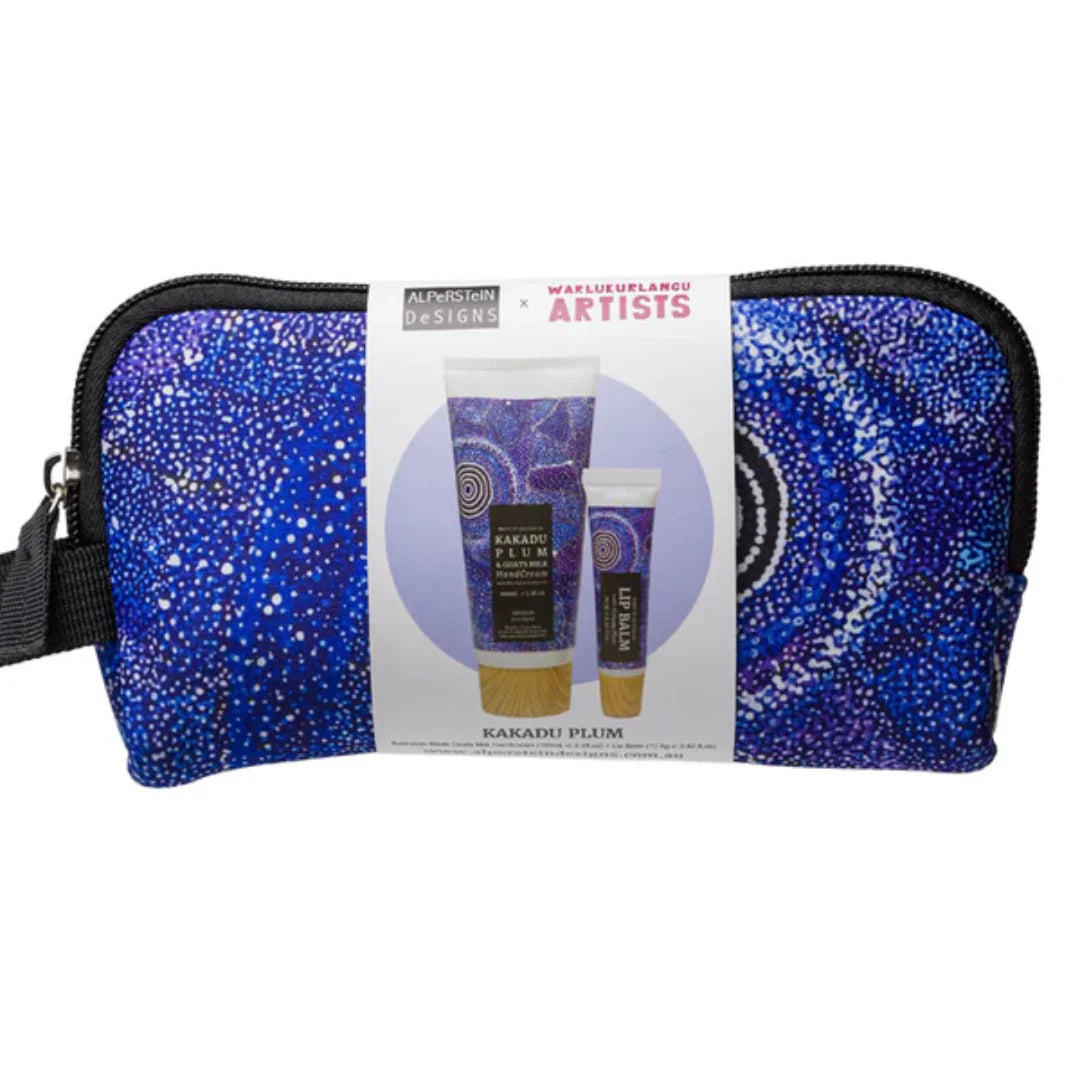 Indulge your senses with Australian made handcream and lip balm featuring Aboriginal artwork by Alma Granites from Warlukurlangu Artists in Central Australia. Gift Packed in a matching neoprene case this is the perfect gift to give or indulge in yourself.
