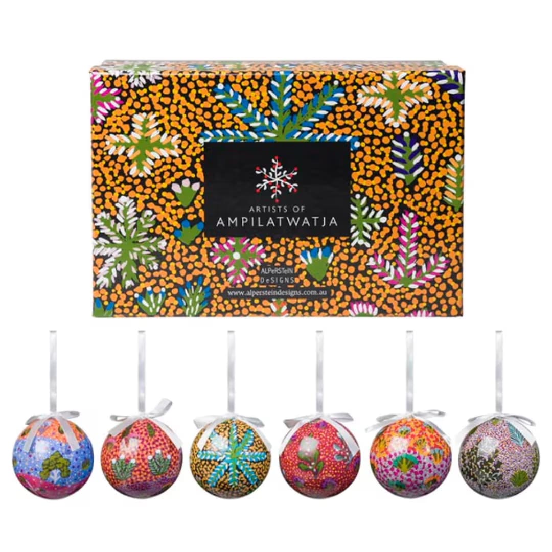 6 Pack Christmas Baubles featuring artwork reproduced under license from Artists of Ampilatwatja.
