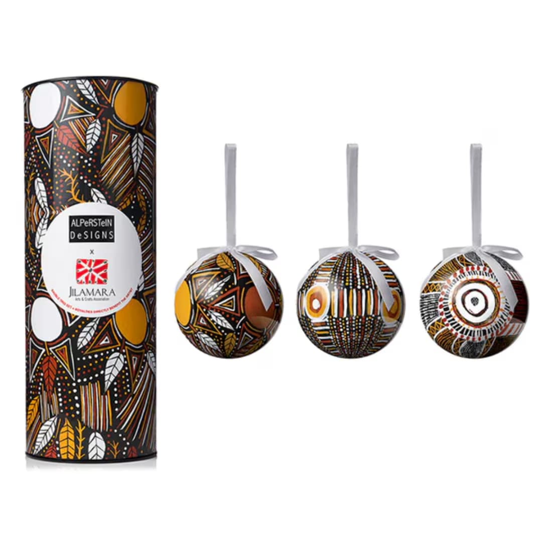 3 Pack Christmas Baubles featuring artwork reproduced under license by Jilamara Arts & Craft Association.