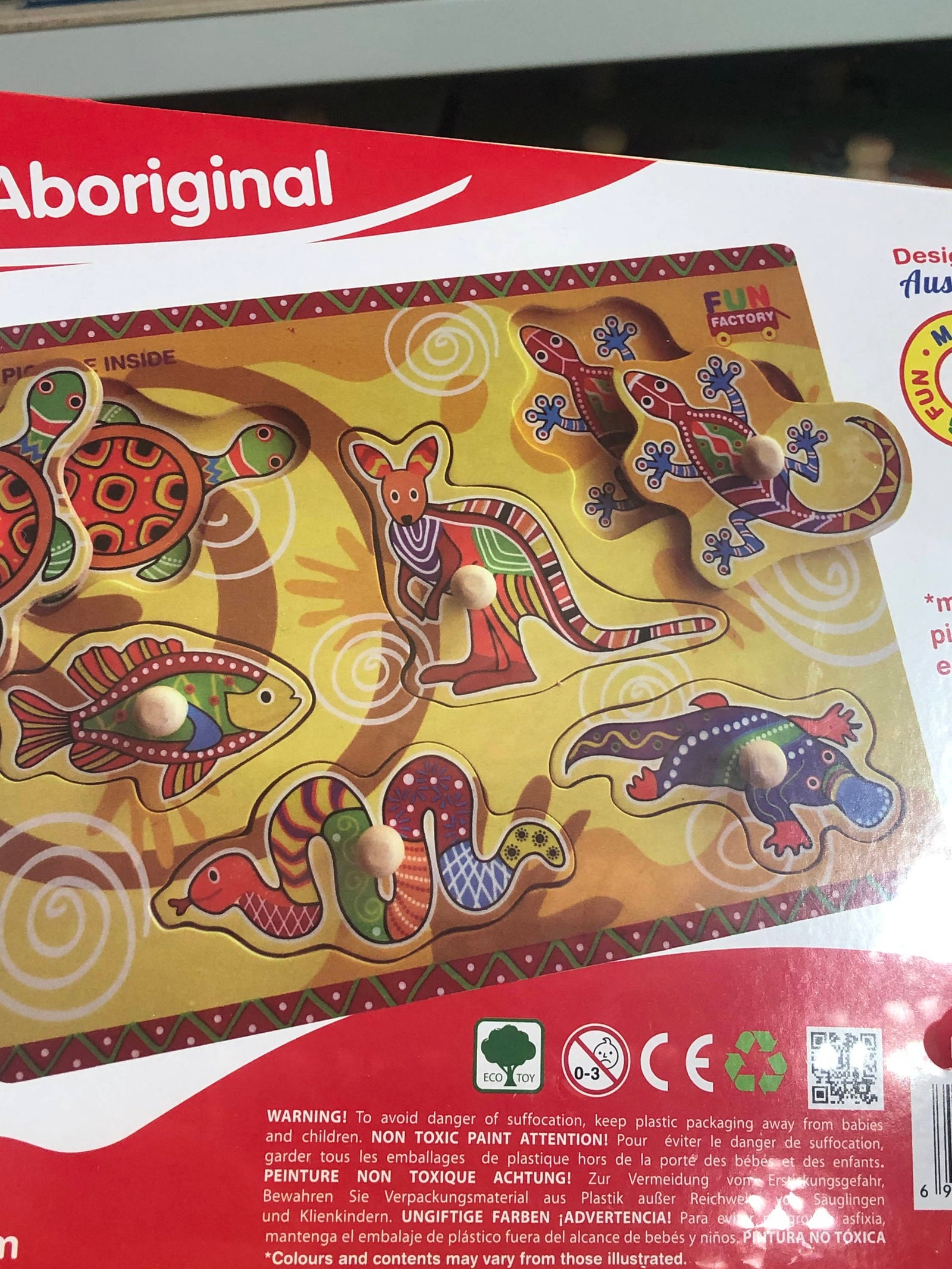 When reviewing the shops puzzle collection I could only find one “Aboriginal” puzzle. However, there was no information provided regarding who the artist was or the story behind the artwork. I hazard a guess and concluded that this was probably an example of fake Aboriginal art.