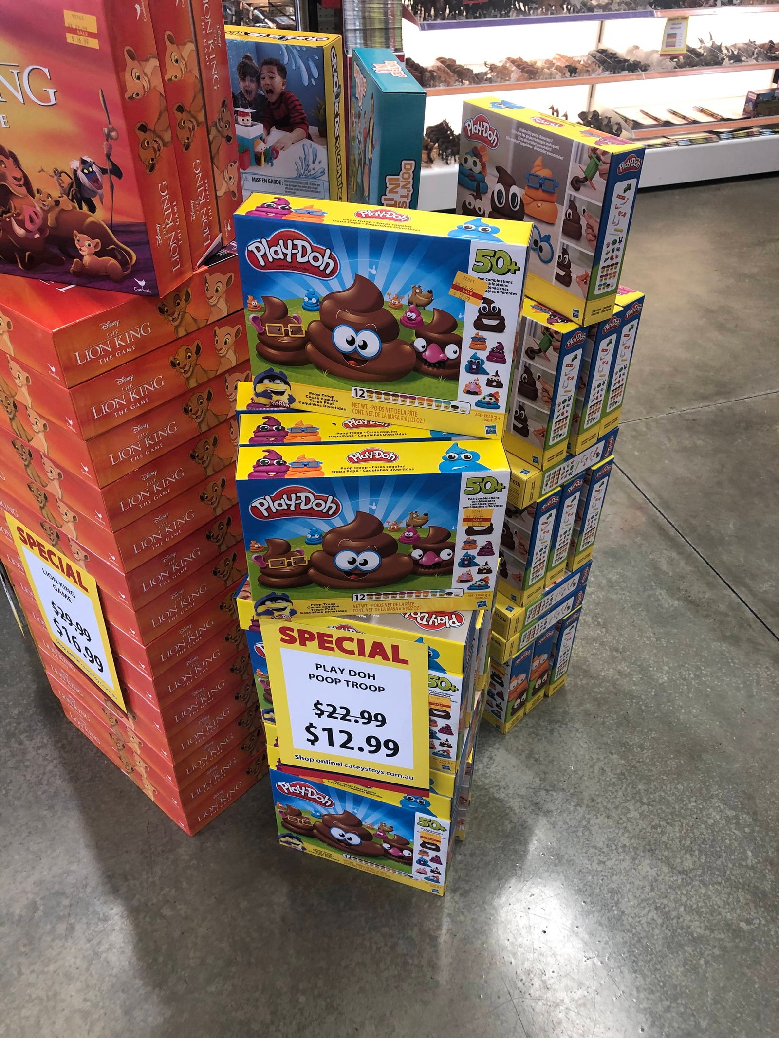 Upon checking out in the corner of my eye I noticed a tower of a product next to the cash register. As I turned to look I recognised that this was a range from Play Doh and this product in fact was their poo doh range. Don’t get me wrong, toilet humour is not lost on me. However, when I then circled back to check out the other play doh products I found that the colour brown was not included in any of there other ranges that they had in store.