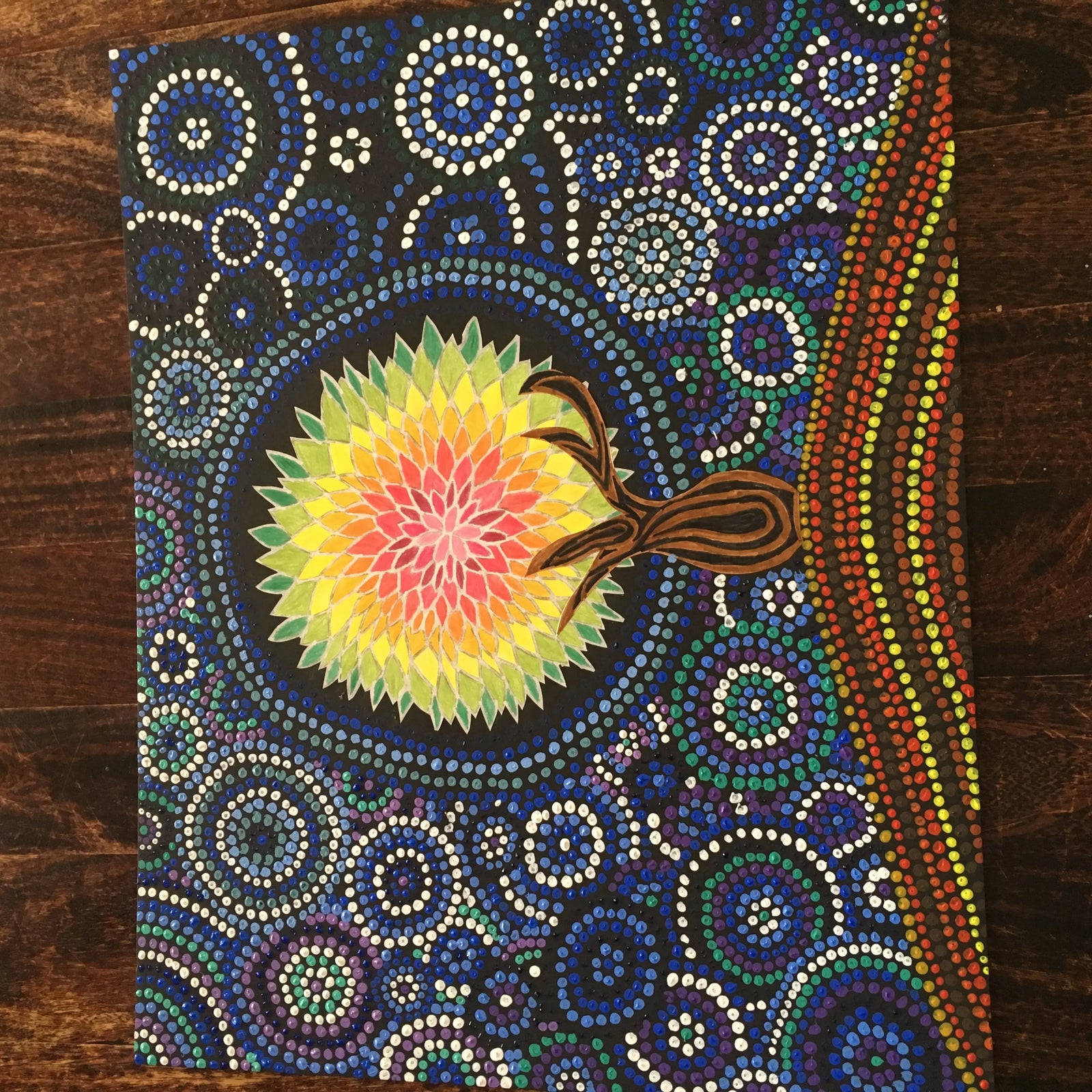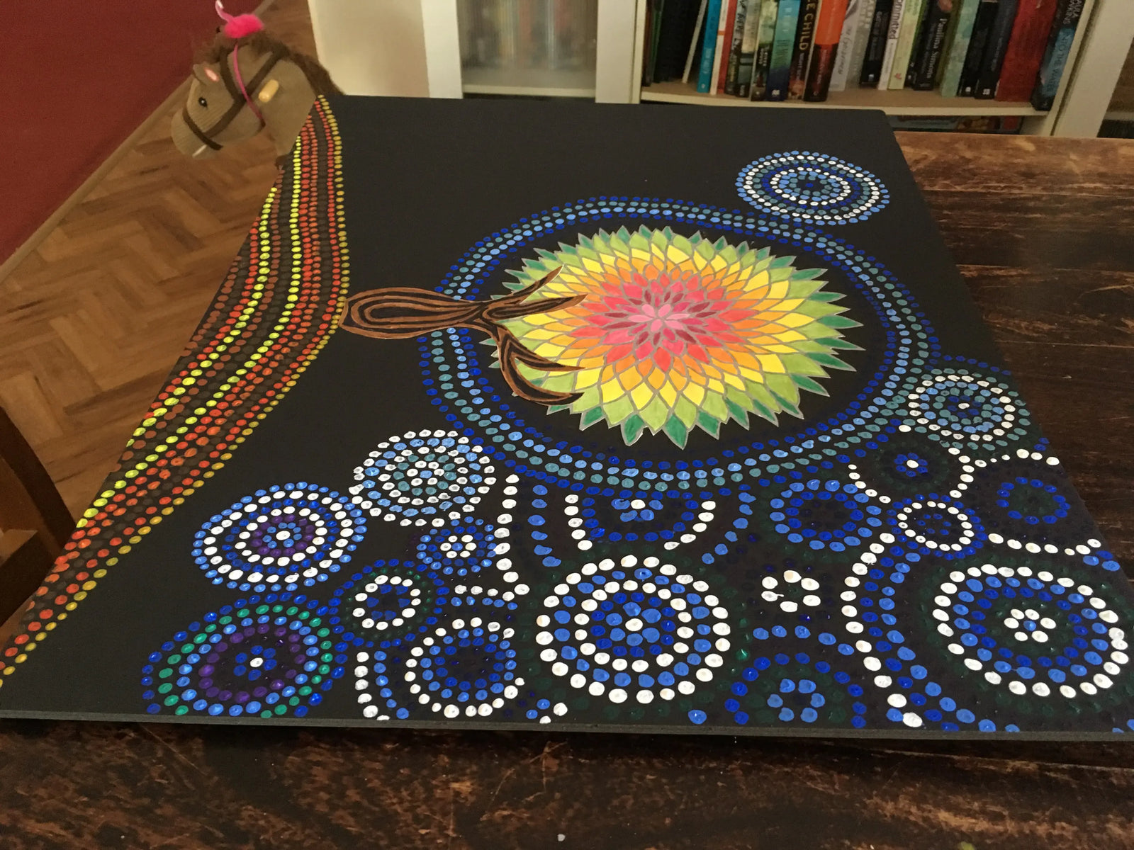 The first project I did with the children was the typical “dot art with cotton buds” and I’m embarrassed by it now, it was not respectful teaching. I promise I’m doing better now!However, I loved how we did it- we had the painting set up with a few colours every morning and over the next few weeks each child, their parents, siblings and grandparents all contributed to our collaborative art piece.