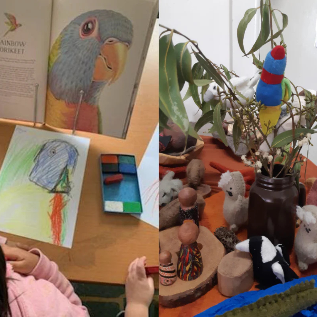 "During the backyard bird count week the children developed a stronger interest in the various tpyes birds they can see each day. On our visit to the park some of the children were unsure of what some of the birds looked like. The use of the bird puppets placed into the children's play has provided them opportunities to engage with the birds, exploring their names and colours. The book has further extended upon this and the children have loved recreating their own pictures of the birds they love the most." Natalie Smith