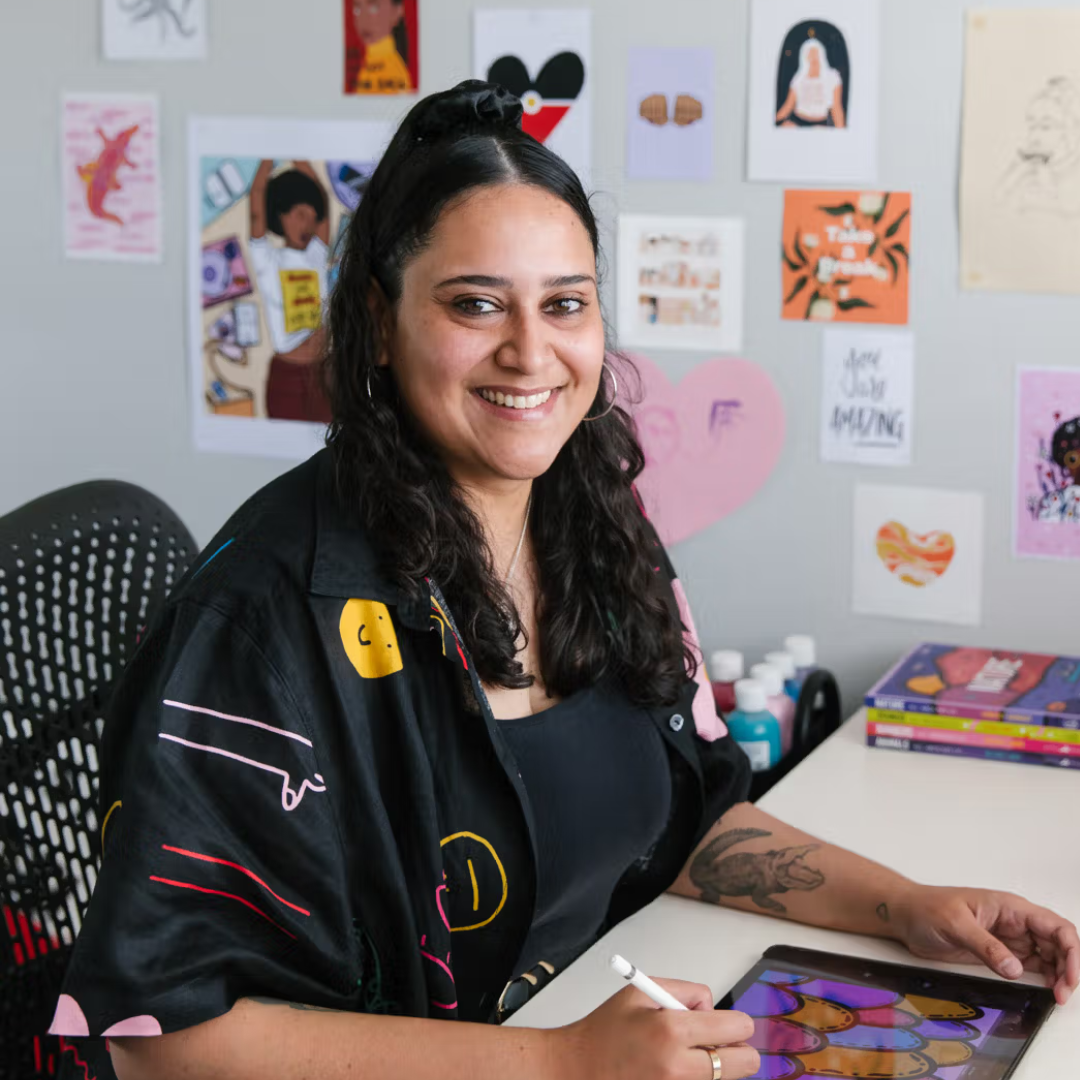 Kimberly Engwicht is a proud Aboriginal and South Sea Islander woman based in Meanjin (Brisbane). She is a multidisciplinary artist, storyteller, and designer known for her joyful and empowering creations. Kimberly’s vibrant art style reflects her heritage and values, drawing inspiration from her cultural roots, natural surroundings, and her passion for children’s storytelling.