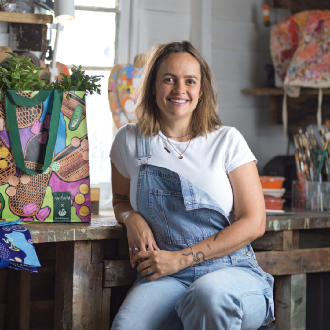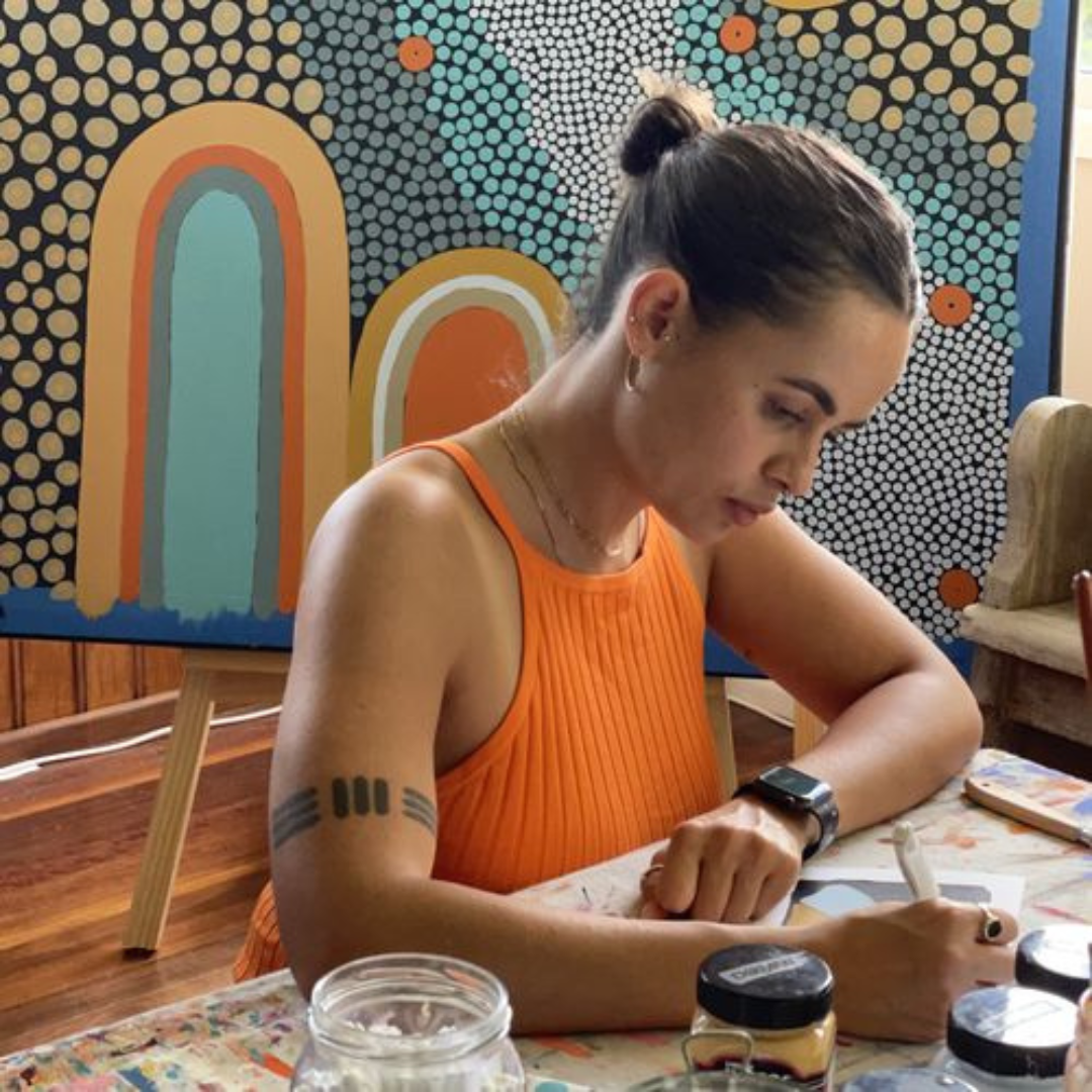 Ryhia Dank is a Gudanji/Wakaja artist and storyteller who grew up in the remote Northern Territory and now lives in contemporary urban Australia. Her unique visual language—what she calls “storywork”—draws on traditional pattern and design to share culture, memory, and identity. Her practice is named Nardurna, a Gudanji word meaning “woman,” and is rooted in a Dreaming story of three women who came from the ocean to shape the hills and freshwater Country near Ngukurr.