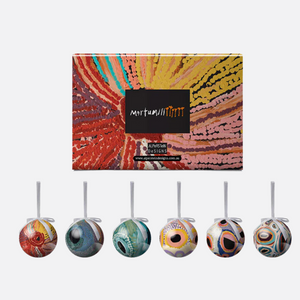 Decorate your Christmas tree with this 6 Pack Xmas Baubles set featuring incredible artworks (reproduced under license) from the talented artists at Martumili Artists. Christmas decorations come gift boxed so after you have packed up your tree they can be safely returned to the box for storage till next year.