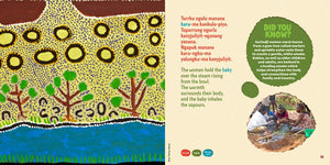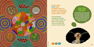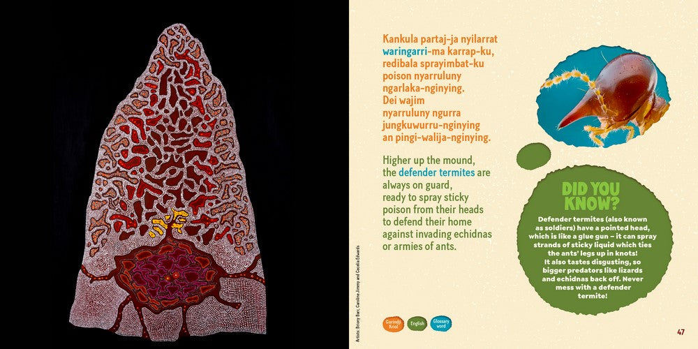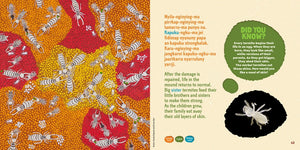 Created as a collaboration between over 30 First Nations and non-Indigenous contributors, the story and artworks explore how termites and their mounds connect different parts of Country, from tiny Gurindji babies and their loving grandmothers, to spiky spinifex plants growing in the hot sun.