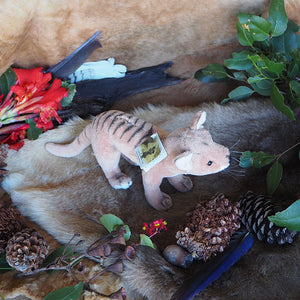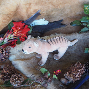 Sammy is a medium size realistic Tasmanian tiger plush toy. The Tassie tiger, also known as Thylacines, are an extinct species of this native Australian animal. This handcrafted Tasmanian tiger with hand air brushed details is soft and measures 22cm/8.5″ in length with out the tail or 28cm/11″ with the tail and 14cm/5.5″ in height.
