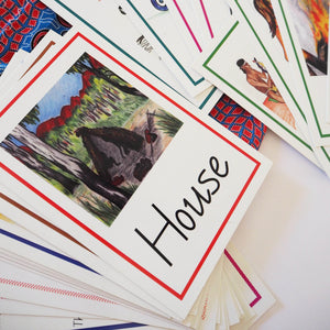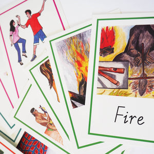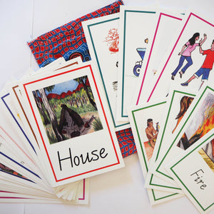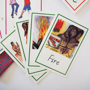 Supplied in a handmade Aboriginal fabric bag. Children match cards of modern day life with the cards showing images of the way Aboriginal Australians lived for thousands of years. For Memory Match, Snap, Fish etc. 32 cards, laminated. Ages 5 to 10