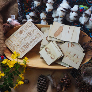 This 36 piece tile set feature Indigenous symbols used by Aboriginal people to illustrate their Dreaming stories and also as a way to record information such as marking a sacred site, a place where animals live or the location of a waterhole and how to get there. A timber engraved legend showing the symbols and their meanings is also included.