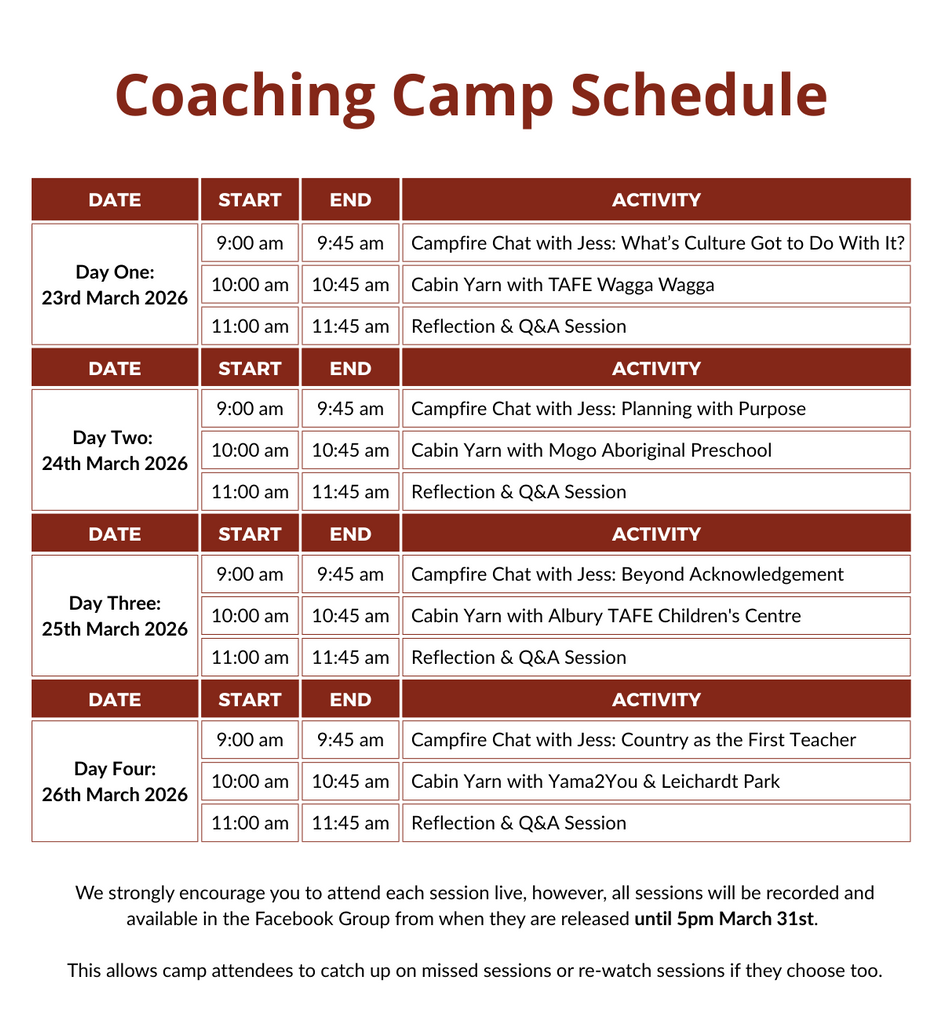 The Coaching Camp badges are a way to honour your learning journey and make it visible. These badges are not about ticking boxes or claiming expertise, they represent time spent listening, reflecting, and building understanding alongside Jess, the KC team, and fellow educators. Displayed in your service or professional space, they signal a commitment to culturally responsive practice and ongoing learning, rather than a finished destination. The optional Badge Pack supports meaningful conversations with colleagues, families, and communities, offering a gentle prompt that this work is active, relational, and always evolving.