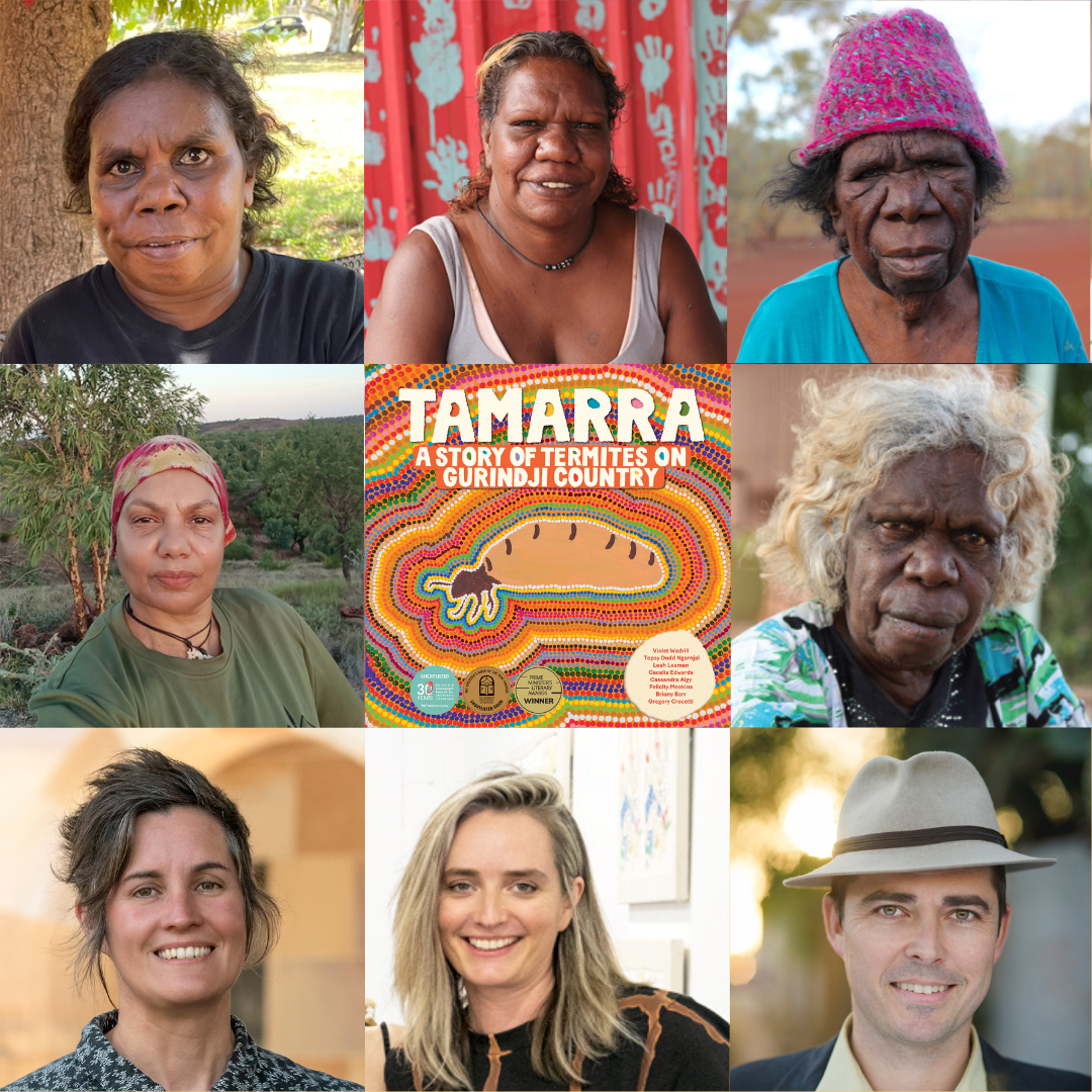 The co-creators of Tamarra are a diverse group of First Nations and non-Indigenous people. For over four months in 2021, they came together on Gurindji Country to explore a shared interest in termites and with a curiosity about how they could create a new kind of storybook together.