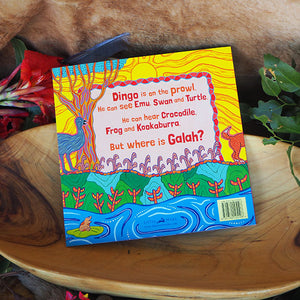 Dingo is on the prowl. He can see Emu, Swan and Turtle. He can hear Crocodile, Frog and Kookaburra. But where is Galah?